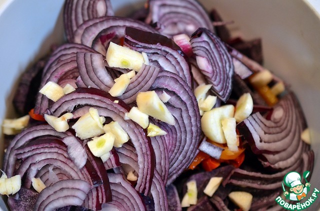 Лук нарежьте полукольцами, чеснок порубите, - добавить к овощам.