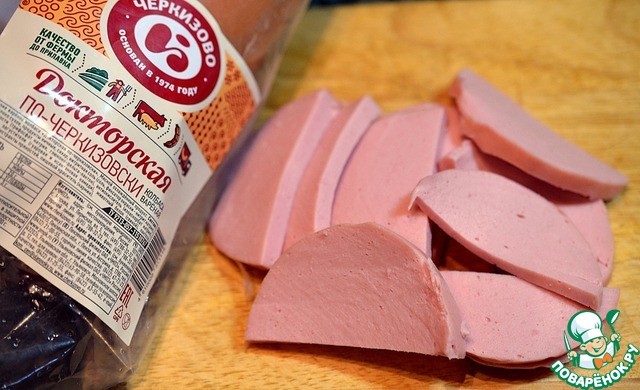Колбасу нарезать ломтиками. Я использую "Докторскую колбасу по-Черкизовски" Черкизовского мясоперерабатывающего завода. Она сделана из натурального мяса и обладает высокими вкусовым качествами.
