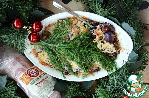 Это сытное и яркое блюдо прекрасно подойдёт для праздничного стола! Можно подать как гарнир, а можно в качестве основного блюда на горячее! Овощи, нежнейшая варёная колбаса и хрустящая корочка из сыра!