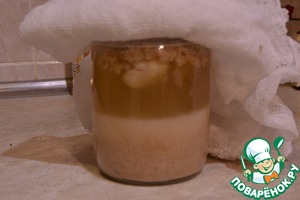 Закваска- жур, готовится приблизительно 3-5 дней, это зависит от качества муки, хлеба, а так же от температуры, при которой происходит брожение. Делаем жур в керамической или стеклянной посуде. Я взяла пол-литровую банку. Кладем в банку муку, заливаем до половины водой, размешиваем, добавляем раздавленный чеснок (если чеснок без грязи, говорят, можно не чистить, но я почистила), лаврушку, перец, хлеб, доливаем воды до полной банки. Закрываем марлечкой и ставим в теплое место. У меня на кухне-рядом с плитой.
