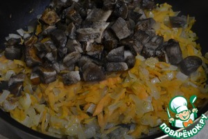 Добавляем натертую на крупной терке морковь, тушим минут 10, добавляем нарезанные грибы, тушим минут 10. Картофель мелко режем.