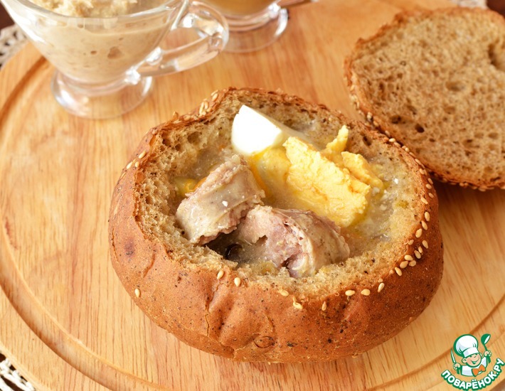 Традиционный польский суп Żurek- суп на мучной закваске. По вкусу отдаленно напоминает или рассольник или солянку. Рецептов его существует множество. Иногда его подают в хлебе, но так я его никогда не заказывала, потому что не знала- что делать с остатками хлеба-съесть бы я его точно не смогла, тем более, что порции в Польше и без хлеба огромные. Полагаю, что для такой подачи, хлеб должен быть не сильно пористым, что бы быстро не размокал, скорее всего, хлеб специально выпекают для таких целей. Так что если вдруг надумаете подавать такой суп в хлебе-будьте осторожны- обычный как губка впитывает в себя бульон. Но я делала для себя, поэтому использовала булочки, которые подошли по размерам, но достаточно быстро размокли, но не протекли. Так же я встречала рецепты, где сметана добавляется прямо в кастрюлю, но я так сделать не решилась.