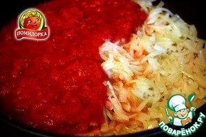 3. Открываем банку маринованных помидоров или томатов в собственном соку "Помидорка", режем их на две части или дольками если получится - нужен острый нож. Укладываем поверх луковой "подушки".