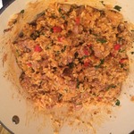 14. Теперь выкладываем рис сверху мяса, а на рис выкладываем обжаренные ранее овощи.