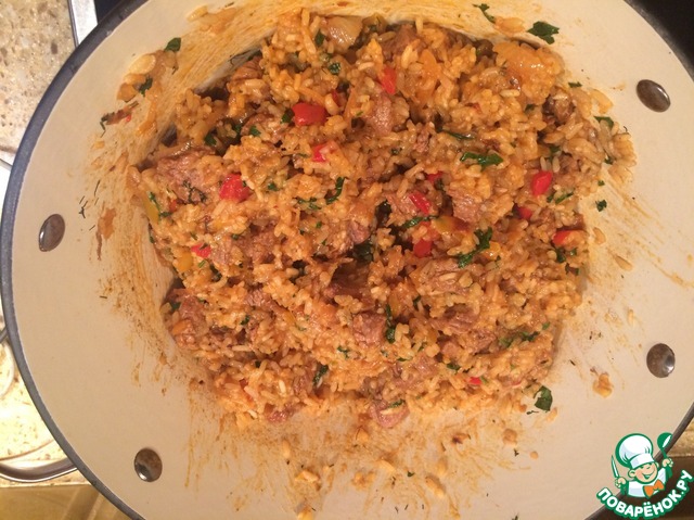 18. Готовый плов выложить на блюдо, добавить оставшуюся подливу и посыпать зеленью, приятного аппетита!