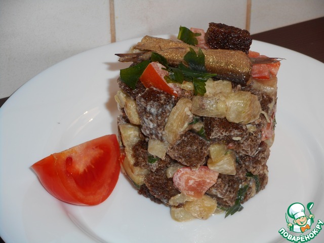 Собираем наш салатик: баклажаны смешиваем с сухариками, помидорки режем на половинки, соединяем все ингредиенты с майонезом. перемешиваем. Я сформировала салат с помощью железного кольца, добавила немного зелени, и пару шпрот для украшения. Приятного аппетита!