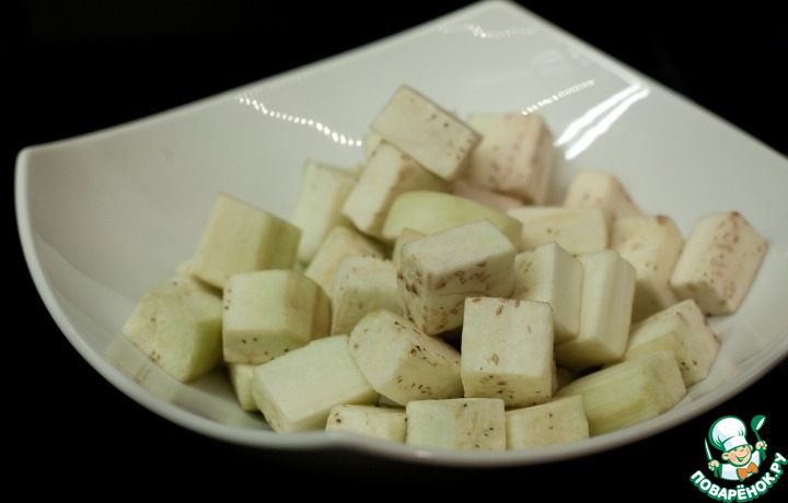 Баклажан очищаем от кожуры (замачивать в воде баклажан не стоит, т. к. горечь содержится только в тех баклажанах которые растут на открытом грунте, в данный период времени баклажаны, которые продаются в магазинах растут в теплице, и не содержат горечи), режем на кусочки.