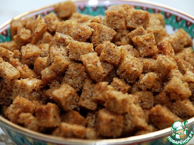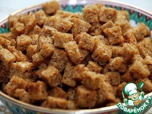 Хлеб режем на ломтики, срезаем с них корочки со всех сторон, нарезаем кусочками как на сухарики. Обжариваем на сковороде так же с добавлением оливкового масла.