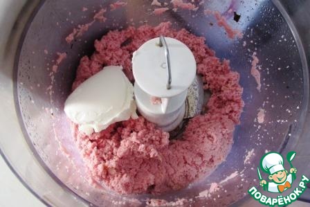 В несколько приемов измельчаем колбасу с луком в очень мелкую, однородную массу.