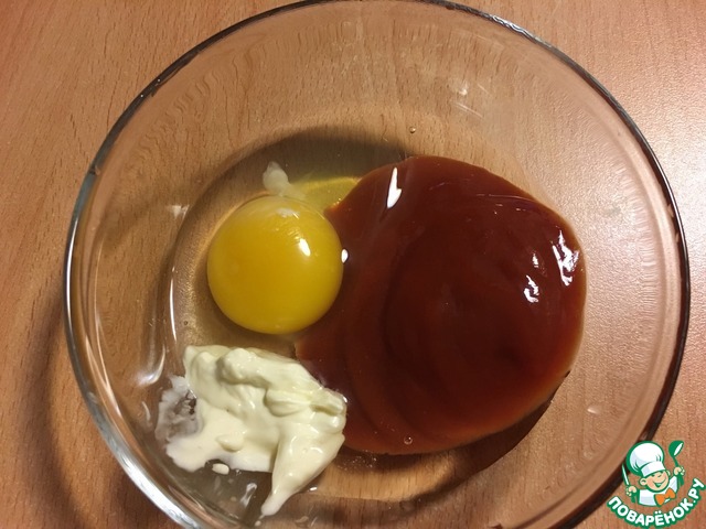 Смешать 1 яйцо, майонез и кетчуп, взбить