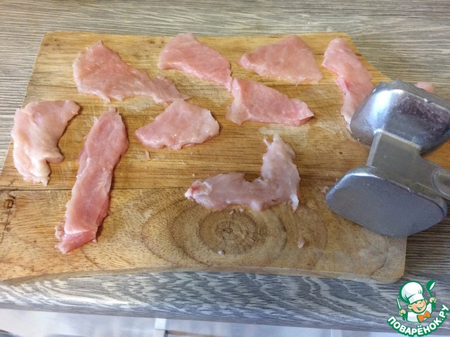 Режем мясо (свинина или говядина, у меня свинина) на небольшие кусочки, затем отбиваем молотком (не обязательно), но мне показалось так вкуснее