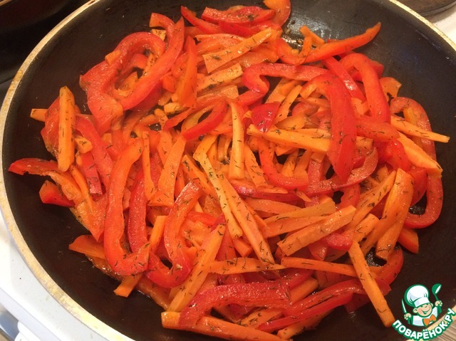 На этой же сковороде обжариваем красный перец и морковь (порезать соломкой), тушить не нужно, обжариваем около 7-10 мин, я добавляла приправ для вкуса, можно укропчиком посыпать. Выкладываем к мясу