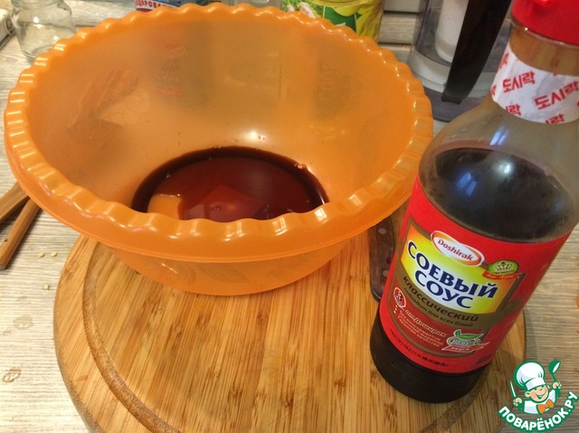 Берем глубокую миску, добавляем 5 столовых ложек соевого соуса