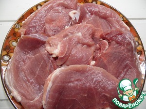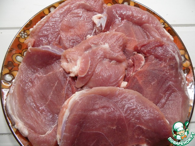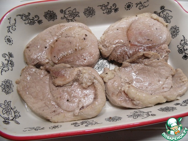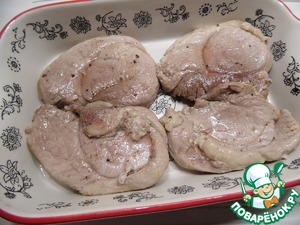 Свинину нарезать большими ломтиками, натереть измельченным чесноком, солью и перцем.