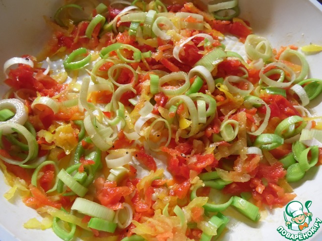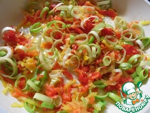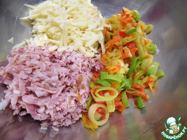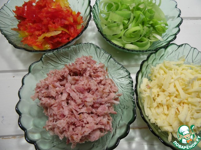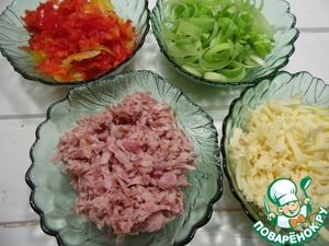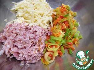 Для "одеяла". Колбасу, перец и сыр натереть на крупной терке, лук-порей нарезать колечками.