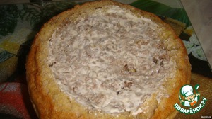 • Начинаем собирать запеканку: 1 слой - часть картошки равномерно положите в хлеб, сверху смажьте майонезом