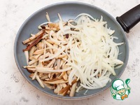 Поставьте варить яйца. Грибы (у меня боровики) и лук (если не любите, можно без него) нарезать соломкой и обжарить на сковороде до готовности. Немного посолить. Остудить.