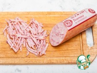 Ветчину "По-Черкизовски" нарезать тонкой соломкой. Немного соломки отложите для украшения.