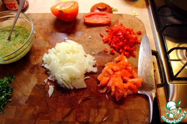 Нарезаем овощную часть не очень крупно. На фото вы видите, что я использовал не целый перец и меньше половины помидора (крупный он), а главное, вы можете видеть, что объем лука составляет, примерно, половину объема остальных овощей. Я считаю этот момент довольно важным.