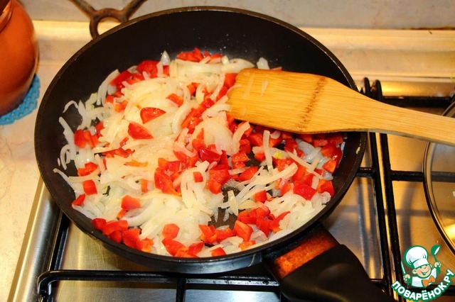 На растительном масле обжариваем лук и болгарский перец. Огонь довольно сильный, но зажаривания не допускаем, постоянно помешиваем. На это уходит минут 5, примерно. За это время лук успевает размягчиться и зазолотиться, а перец успевает приготовиться, что называется, альденте.
