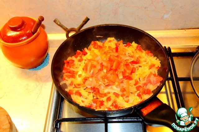 Так выглядит содержимое сковородки, когда уже можно добавлять помидор. Сравните с предыдущим фото.