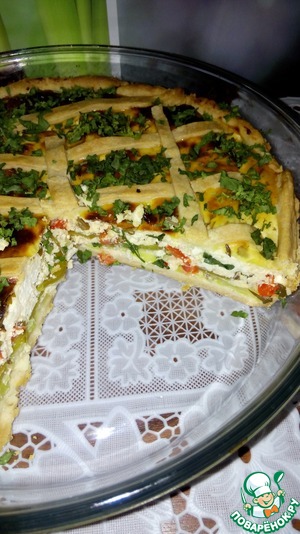 Смазать форму маслом, присыпать мукой. Выстелить форму 3/4 теста, сделать бортик. Наколоть тесто вилкой в нескольких местах. Разложить овощи.