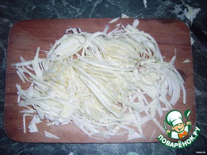 Нашинковать капусту, примерно половинку маленького кочанчика, и помять ее с солью.