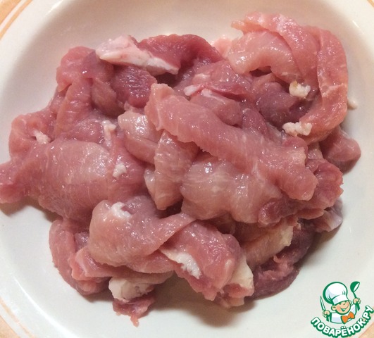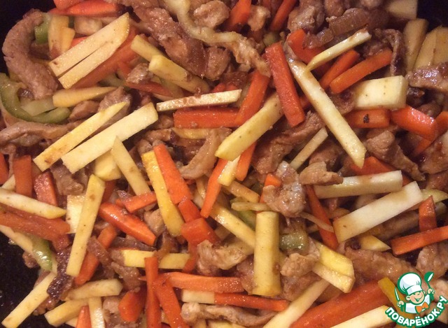 Сразу оговорюсь, что количество овощей и мяса должно быть приблизительно равным по количеству, т. е. 1 часть мяса, 1 часть дайкона, 1 часть моркови, 1 часть болгарского перца.