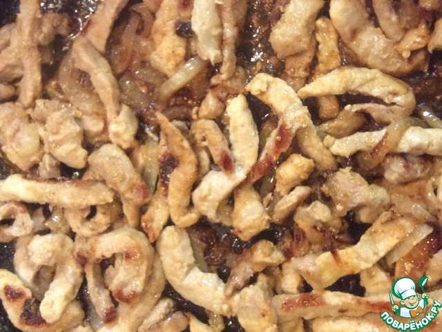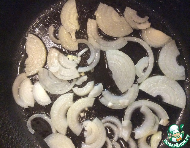 Лук нарезать полукольцами и обжарить до золотистого цвета.