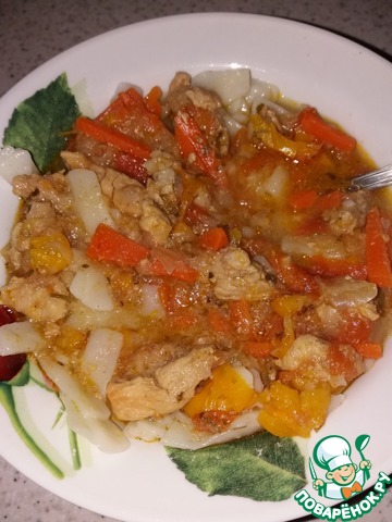 Тем временем отварить лапшу. Откинуть на дуршлаг. В глубокую тарелку выложить лапшу, сверху выложить овощи и полить бульоном.