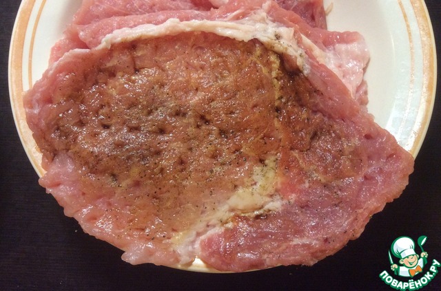 Отбитый кусочек мяса смазать соевым соусом, слегка посыпать черным молотым перцем (по вкусу).