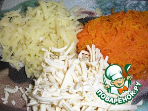 Картофель и плавленный сырок натереть на крупной терке, а морковь на мелкой.