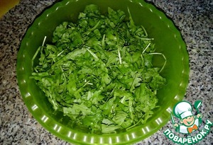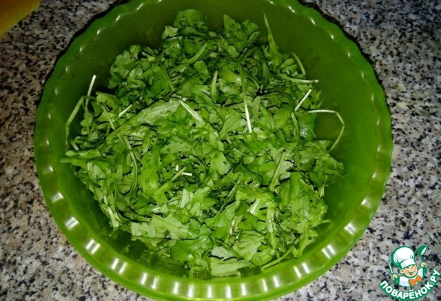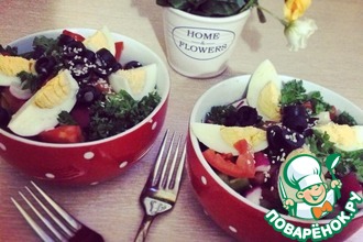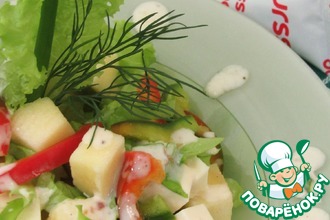 Соединить ингредиенты. Смешать оливковое масло, белый винный уксус, специи и соль. Заправить, перемешать,