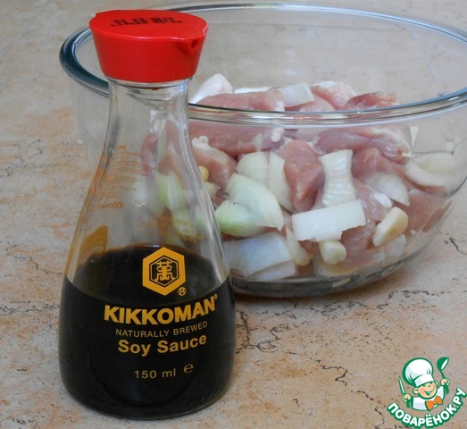 Мясо, лук, чеснок положить в миску, добавить соевый соус ТМ Kikkoman и оставить мариноваться минимум на 1 час. Я оставляю на ночь.