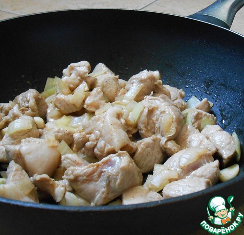 Разогреть в сковороде растительное масло, выложить мясо вместе с луком и маринадом и, помешивая, обжаривать 1-2 мин. Затем добавить 1 стакан воды, убавить огонь и тушить мясо под крышкой 15-20 мин.