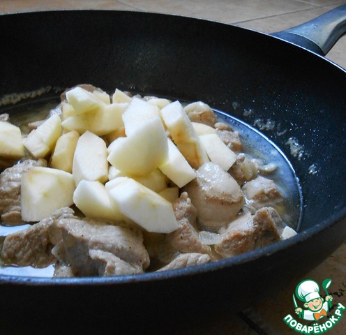 Добавить к мясу яблоки, имбирь, черный перец, соль (если необходимо) и тушить 40-45 мин до готовности мяса.