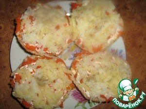 Уложить на морковь, прижимая ножом, посолить, присыпать черным молотым перцем. -