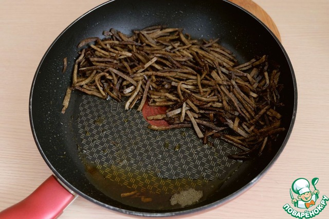 Печеночную соломку обжарить на среднем огне до образования легкой корочки. Далее сковороду наклонить для удаления лишнего масла. В салате оно не нужно.