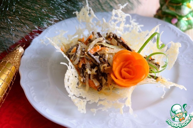 Такой салат вполне украсит ваш новогодний стол и может стать гвоздем программы, если вы подадите его кружевных сырных корзиночках. Гости по достоинству оценят ваше старание.