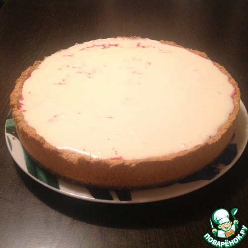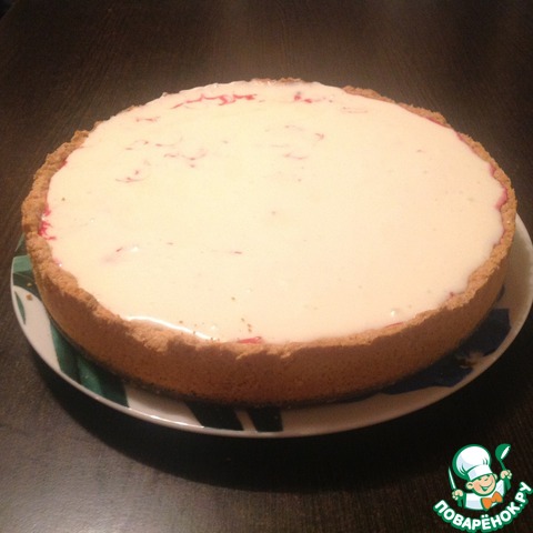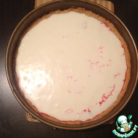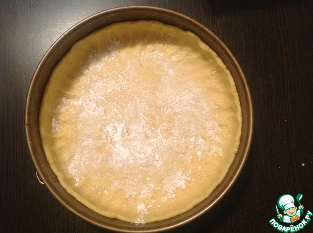 Разъемную форму (диаметр 26 см) слегка смазываем маслом. Тесто достаем из холодильника, раскатываем корж диаметром больше, чем форма. Выкладываем тесто в форму, формируя бортики.