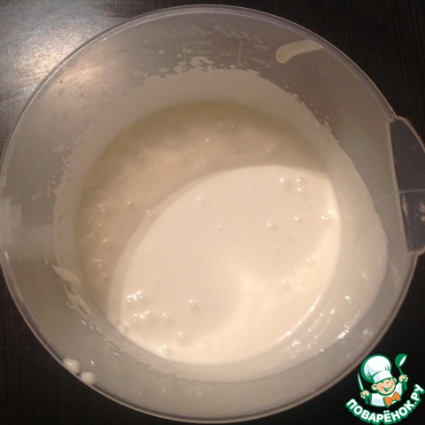 Тем временем приготовим заливку. Для этого взбиваем сметану с сахаром до загустения. Сметана должна быть достаточно жирной.