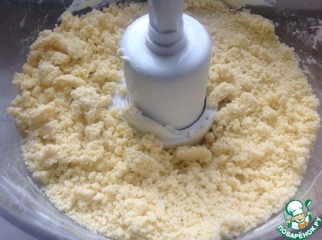 Приготовим песочное тесто. В чашу блендера просеиваем муку, добавляем сахар, ванилин, разрыхлитель, соль и порезанное на кусочки масло или маргарин. Включаем блендер и перемалываем до состояния мелкой крошки.