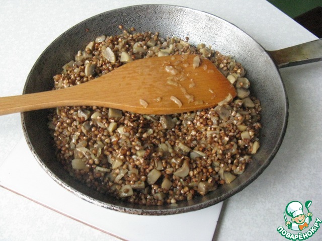 • Мелконарезанный лук обжариваем на растительном масле до прозрачности, добавляем грибы и жарим "до зарумянивания". Добавляем гречневую крупу и, помешивая, жарим еще 1-2 мин.