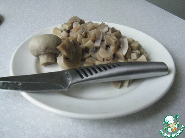 • Почистить и промыть грибы, залить холодной водой, довести до кипения, посолить и проварить на среднем огне 20 мин. Откинуть на дуршлаг, обсушить, остудить и нарезать кубиками.
