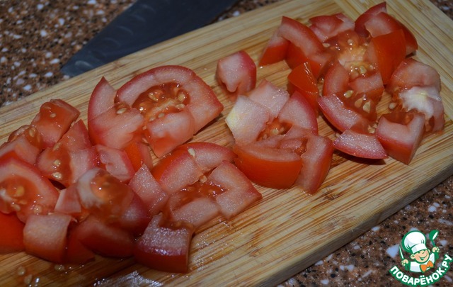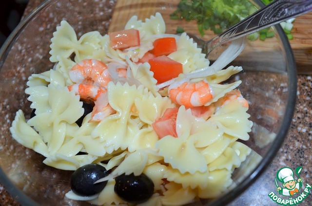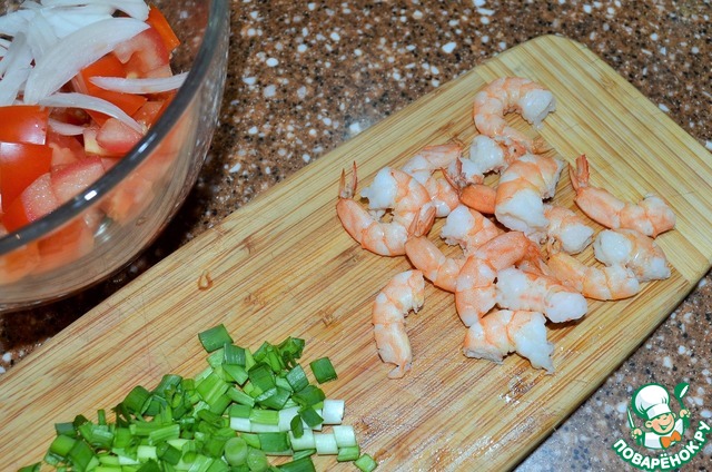 Отварить креветки и пасту. В это время вымыть помидор, зелень, почистить лук. Помидор нарезать на кубики. Выложить в салатник.
