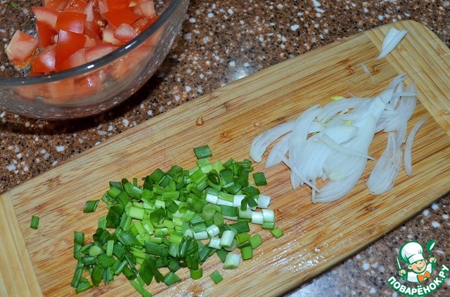 Затем нарезать оба вида лука. Перья белого лука выложить к помидорам.