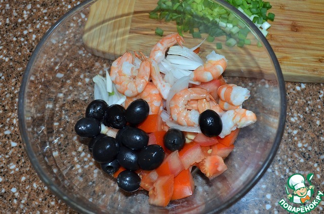 Креветки охладить и почистить, крупные разрезать пополам. Выложить в салатник.