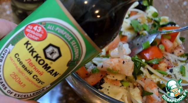 Заправить черным молотым перцем, влить соевый соус. Легкий натурально сваренный соевый соус от ТМ Киккоман придаст данному салату пикантность и отлично "подружится" с креветками. Добавить рубленный зеленый лук и зелень петрушки. Посолить. Перемешать.