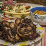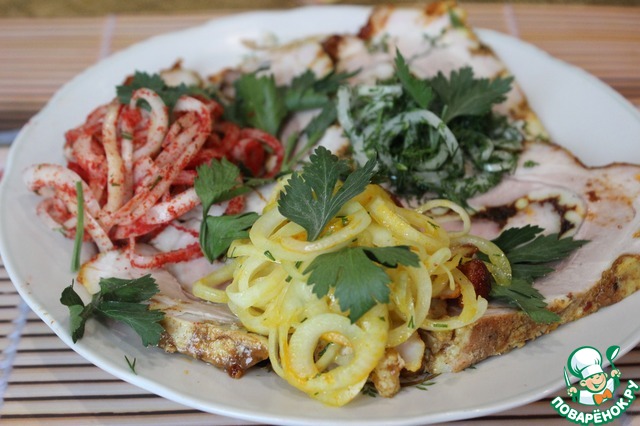 Уже совсем скоро наступает Новый год. Многие хозяйки уже задумываются о новогоднем меню и подыскивают рецепты для праздничного стола. Рискну предложить свой любимый вариант праздничной нарезки. Мясо получается очень вкусным и ароматным. Нарезка очень красиво выглядит на столе. В качестве бонуса расскажу о своем праздничном варианте маринованного лука. Готовится рулет очень легко. Начинающие хозяюшки не бойтесь списка ингредиентов и длинного описания. Все очень просто.