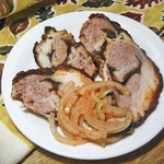 Вот и наш красавец. Его можно подать и в горячем виде, для этого нужно снять шпагат, переложить его на сервировочное блюдо целиком, гарнировать маринованным луком (смотрите ниже), поставить в центр стола, вооружить хозяина дома ножом. Пусть режет рулет и накладывает в тарелки гостям.